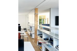 En esta oficina diáfana, la organización del espacio se ha resuelto de manera elegante y funcional gracias al sistema de estanterías Tria Shelving System de